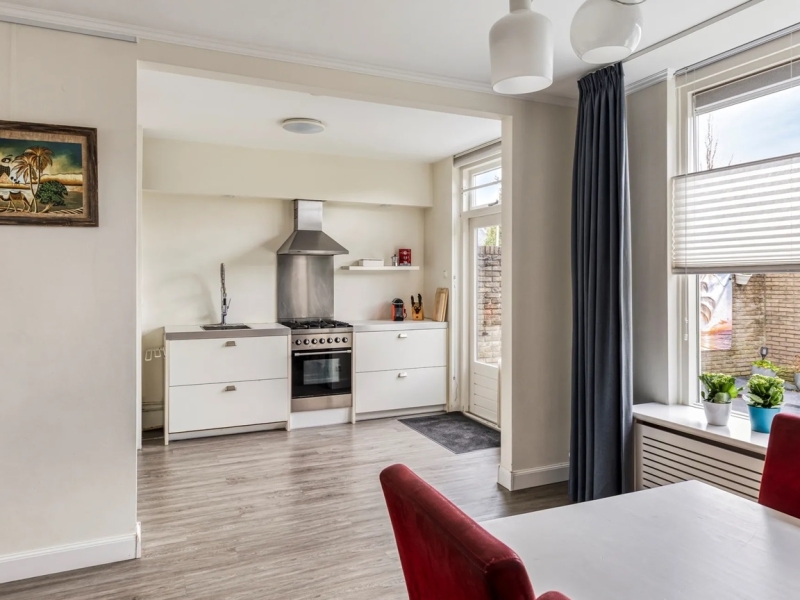 De keuken biedt veel bergruimte en is afgewerkt met een kunststof werkblad. De gehele begane grond is voorzien van een laminaat vloer.
